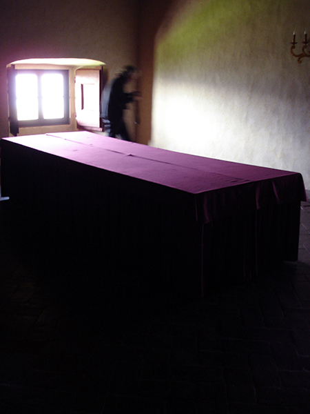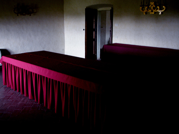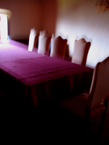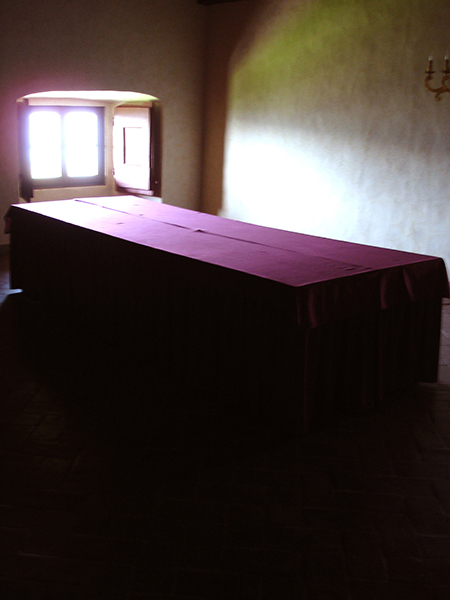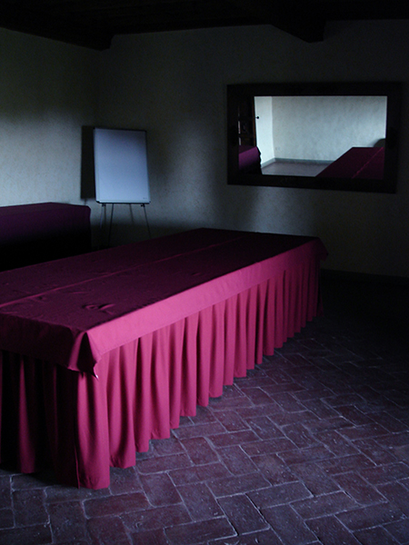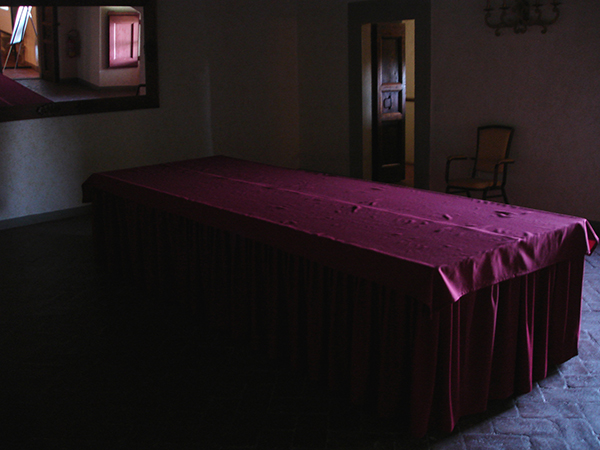 Dans l’antichambre de la parole, l’ombre distribue les rôles, la scène fait partition des possibles victimes d’une histoire qui balbutie. Sur les lieux du colloque rien moins qu’amoureux, la table impose la lourdeur de la loi, tandis que de hautes chaises ciblent autant les juges que les accusés. La masse arrogante de la table simule un catafalque dans les tombées du lourd tissu incarnat Une seule silhouette, furtive, devient le complice masculin de celle qui échappe.